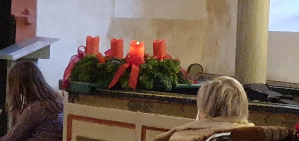 Barbara Lindemann verlas dann eine Adventsgeschichte von 4 Kerzen, von denen 3 wegen des Verhaltens der Menschen vom Wind ausgeblasen wurden, … bis ein Kind vom Feuer der letzten Kerze >Hoffnung< das Licht nehmen und alle anderen – Frieden, Glauben, Liebe – wieder entfachen konnte.