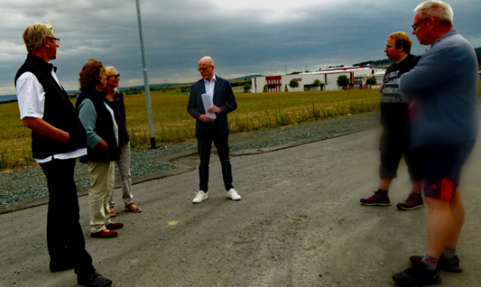 Der Geschäftsführer Bernd Klingelhöfer begrüßt das Bilderbogen-Team vor dem Gebäude, an dem bereits mit dem Innenausbau begonnen wurde. Besucher und Geschäftsführer stehen auf der am 16.9. 20 so benannten „Inwerk-Straße“. Im Hintergrund die Firma Orion.