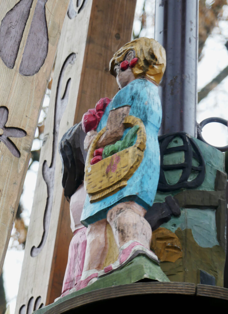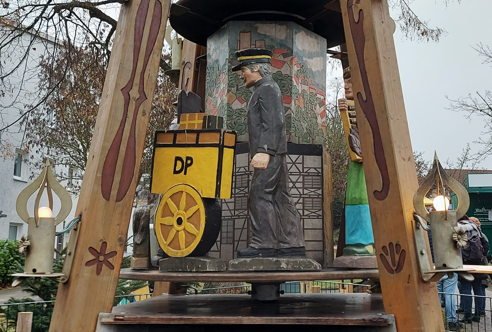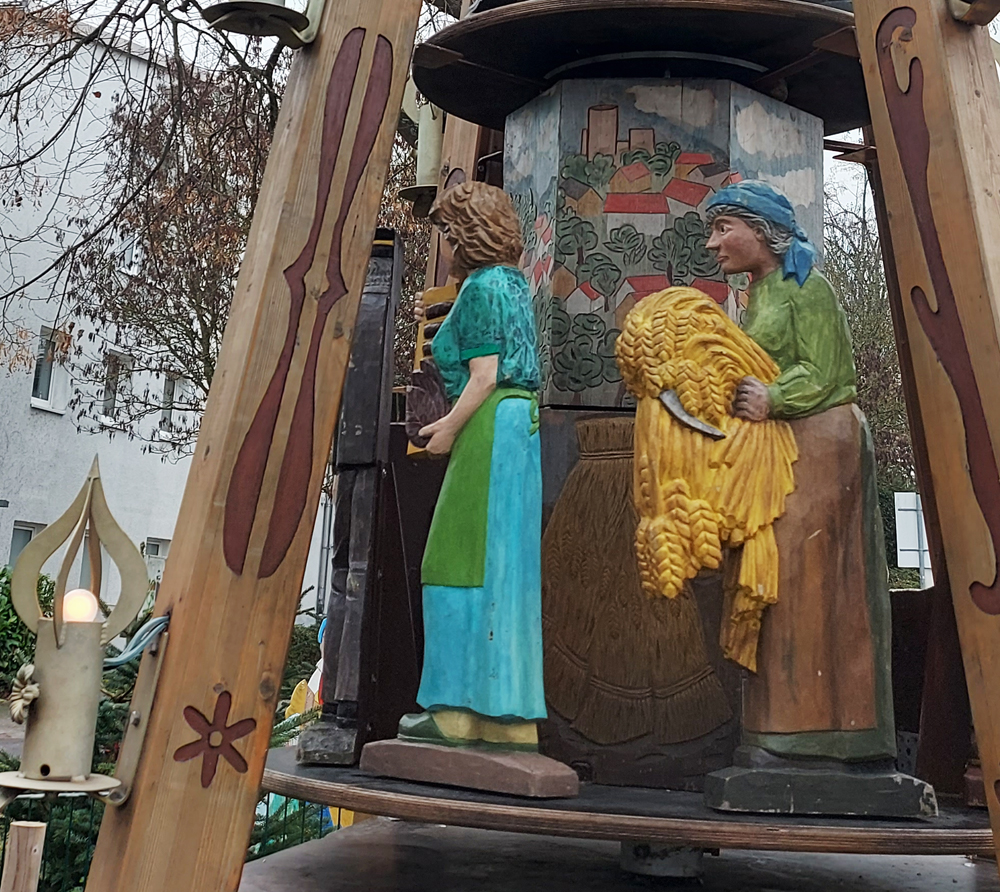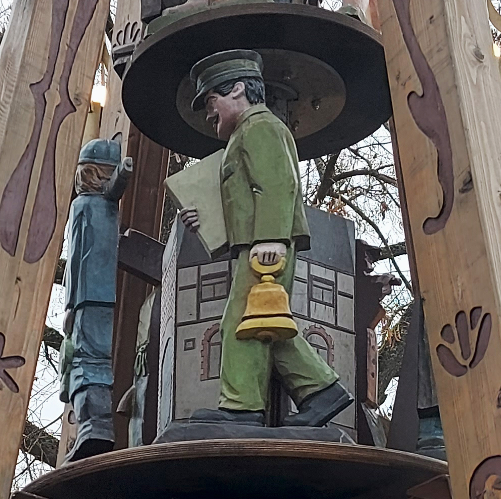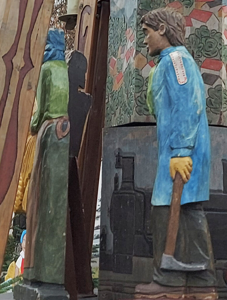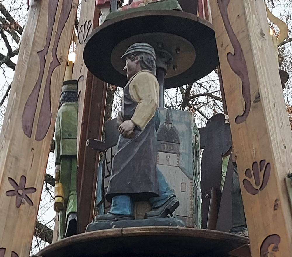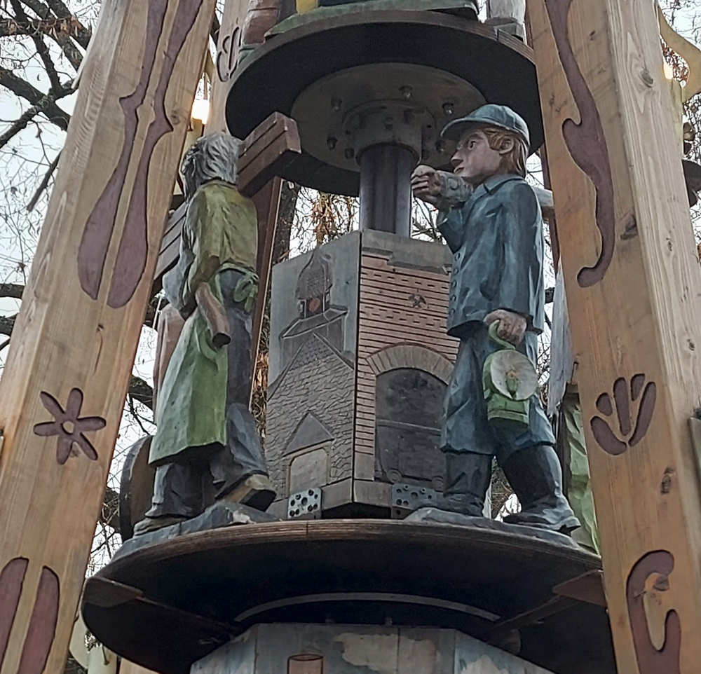 Das falsche Foto? Da haben Sie recht! Diese Pyramide steht nicht in Biebertal sondern in Eibenstock. Und sie sieht recht anders aus als die Biebertaler. Jede Gemeinde gibt sich ihre eigenen Figuren, in der Regel sind das solche, die für die Ortsgeschichte von Bedeutung sind. Das gilt auch für die Ortspyramide, die jetzt wieder auf dem Rasen in der Nähe unseres Rathauses steht. Dort wurden in Absprache mit den Schnitzern aus dem Erzgebirge verschiedene Berufe dargestellt, die in den Orten Rodheim, Bieber, Frankenbach, Krumbach, Fellingshausen und Königsberg ausgeübt wurden.