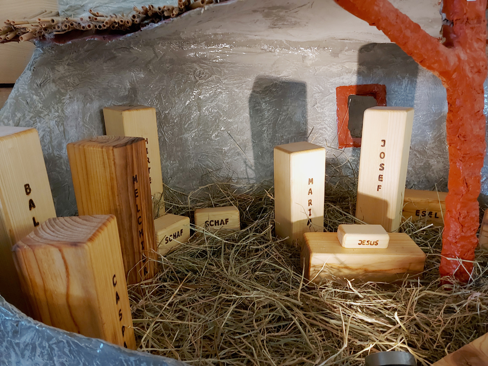 Ein toller Schautisch aus Paletten in der Holzwerkstatt. Alle Krippen können gekauft werden, auch nach dem 26. November
