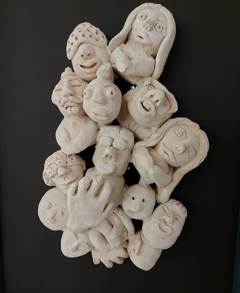 Neben typischer Adventsdekoration können Bilder und andere Objekte aus der Kunstwerkstatt gekauft werden – wie z.B. dieses sehr gelungene Relief mit Köpfen.