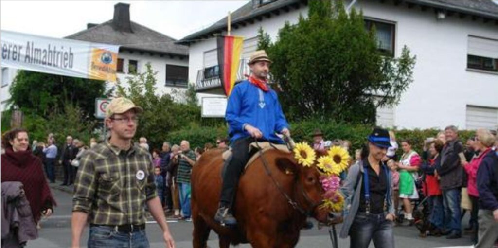 Aus der „Mailhardt“ kommend, durch die Friedrich-Löll-Straße zum Bieberer Sportplatz >Am Hain< führt der „Almabtrieb“ mit 20 Zugnummern aus Tieren vom Hof Stroh in Wettenberg, Hof Mandler in Kinzenbach, Hof Thorsten Schmale in Erda oder einem Anhänger mit Hühnern des Kleintierzuchtvereins Biebertal, Trachtengruppen und historischen Traktoren, begleitet von den Original Biebertaler Musikanten, die den Tag über bis 20 Uhr aufspielen.