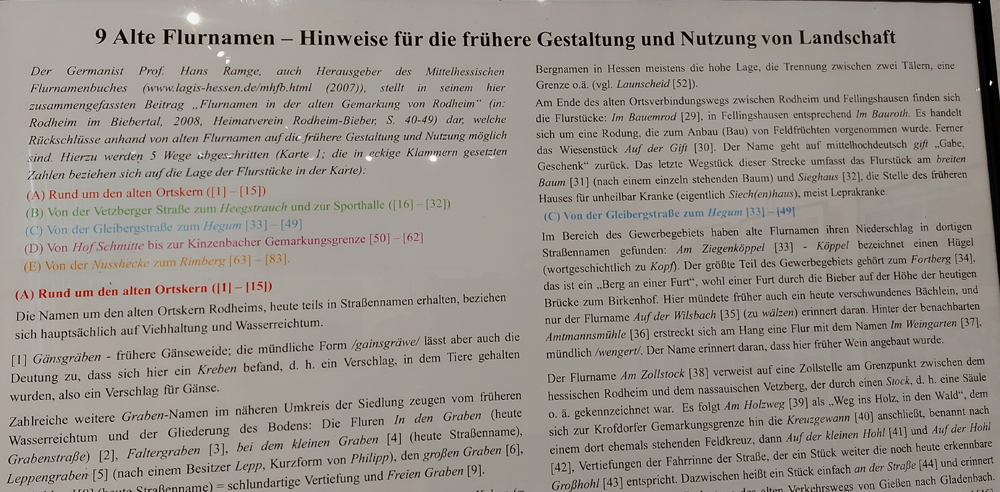 Ich finde die Herkunft von Flurnamen, die zum großen Teil heutzutage Straßennamen sind, sehr interessant. Sie sagen aus, was unsere Vorfahren in der Gemarkung getrieben oder vorgefunden haben. Wenn Sie mehr darüber erfahren wollen, so besuchen sie die Bücherei Biebertal in der Schule Am Bornberg. Dort gibt es viele heimatkundliche Bücher, auch einige von dem oben erwähnten Professor Hans Ramge.