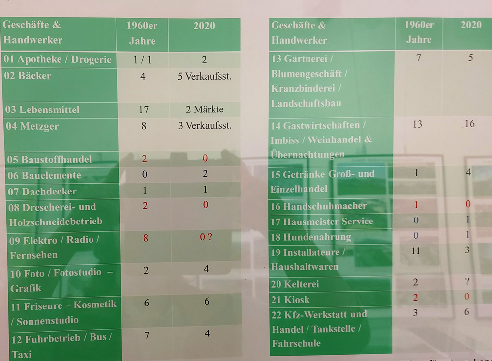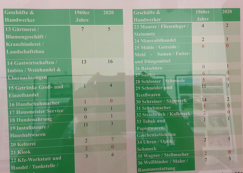 Das Thema Infrastruktur ist wichtig für das Leben eines Dorfes. In den folgenden Tabellen wird die Anzahl der Gewerbe im Jahre 1960 verglichen mit der Anzahl 2020. Da die Fotos sehr schlecht sind, kann es nur heißen: Machen Sie sich vor Ort selber ein Bild! Schade finde ich, dass bei 14 die Branchen zusammen geworfen wurden. Nr. 25 zeigt 1960 noch sechs aktive Mühlenbetriebe. In meinen Interviews mit alten Leuten spielten sie oft eine wichtige Rolle.