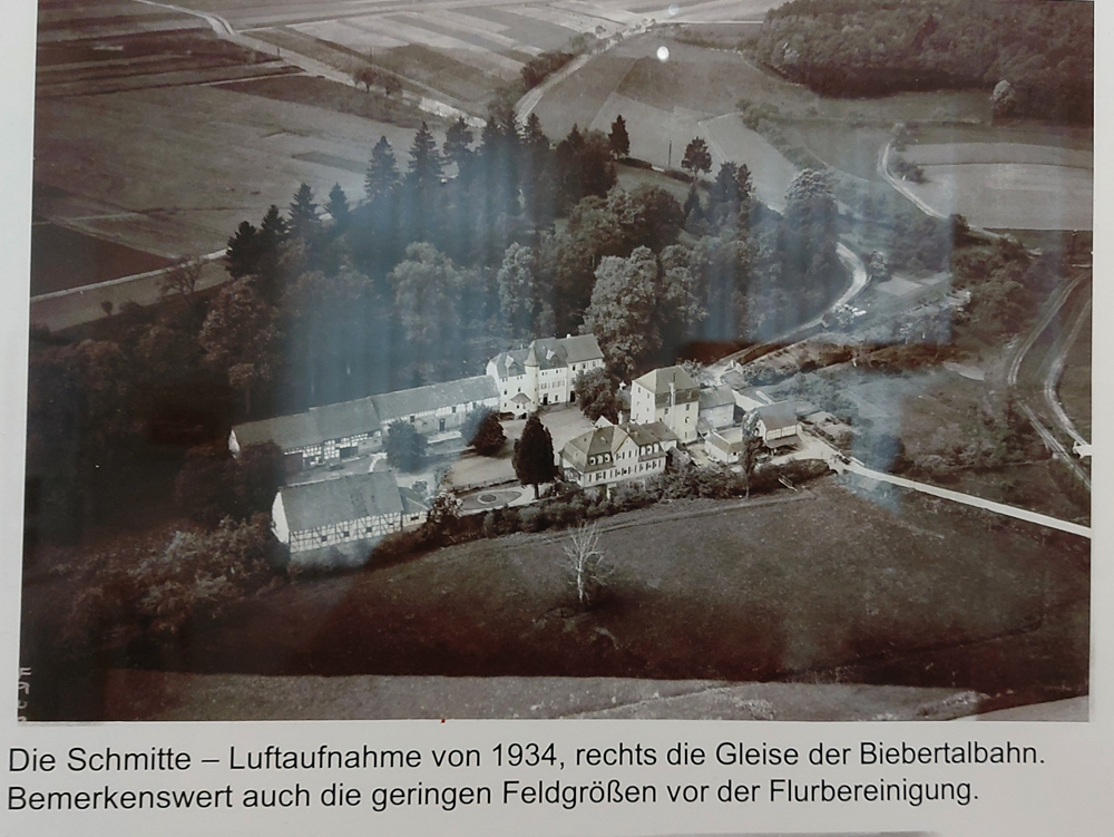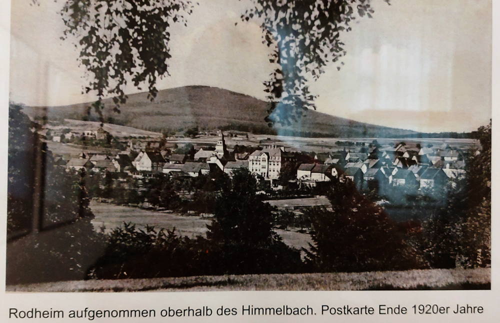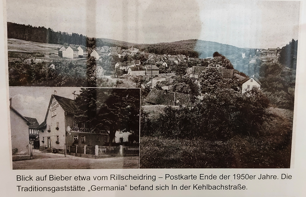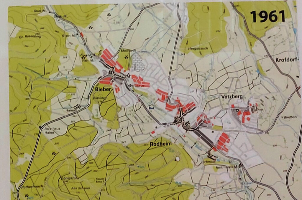 Der Fotograf der oben rechts abgebildeten Postkarte schaute vermutlich aus einem Hubschrauber oberhalb vom heutigen Edeka-Markt auf Rodheim-Bieber. Vorne links sieht man die erst wenige Jahre jungen Schulgebäude am Bornberg. Der Dünsberg ist noch ohne Fernsehturm.