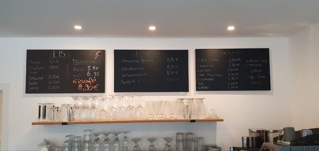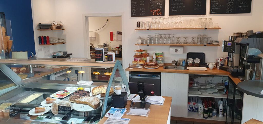 Auf der Speisekarte finden sich neben Eis, Milchshakes und heißen wie Kalt- Getränken, sehr leckere hausgemachte Kuchen (auch vegane) und Gebäck, Frühstücksangebote nach Wunsch und am Sonntag von 9 – 17 Uhr ein ganztägiges Frühstücksbuffet. An den anderen Tagen gibt es zudem von 12 – 15 Uhr einen Mittagstisch, wobei der Dienstag Nudel- und der Donnerstag Hamburger-Tag sind.