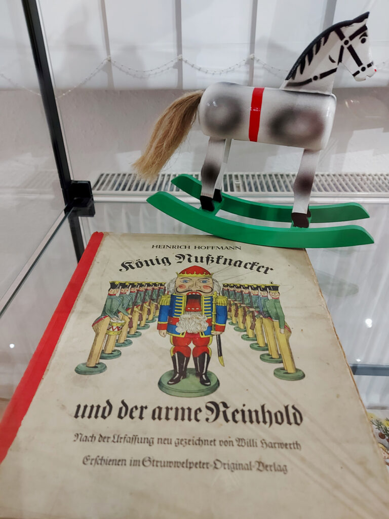 In früheren Weihnachten – selbst erlebt von einigen Anwesenden – gab es vor allem neue Kleidungsstücke. Spielzeug wie z.B. ein Puppenhaus oder eine Holzeisenbahn, wurde vom Boden geholt, etwas aufgefrischt und unter den Baum gestellt . Im Laufe des Winters verschwand es wieder. Ein Buch war schon etwas Besonderes. „Bücher sind Freunde, die stets Zeit für uns haben“ sagt Otfried Preußler (der im Oktober 2023 100 Jahre geworden wäre). Ein Beispiel für ein Buch, das vor allem Freude bereiten sollte, ist das Buch „König Nussknacker und der arme Reinhold“ vom Struwwelpeterautor Heinrich Hoffmann aus dem Jahre 1851. Der Nussknacker stellt dem kranken Reinhold im Traum alle erzgebirgischen Holzfiguren vor. Am nächste Morgen ist Reinhold gesund und findet alle Figuren unter dem Weihnachtsbaum.