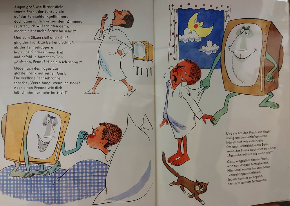 Aber Weihnachten enthielt auch immer das Böse, nicht nur Christkind und Weihnachtsmann. Gemeinsam mit dem Heiligen Nikolaus erschien der Krampus (süddeutsch) oder Knecht Ruprecht (norddeutsch). Auch er hatte einen Sack dabei, aber nicht mit Geschenken. Nein, in diesen Sack steckte er die unartigen Kinder, meistens nachdem er sie mit seiner Rute verhauen hatte. Die Ausstellung zeigt auch einige Bücher, die diese schwarze Pädagogik vertreten. Die Struwwelliese wird in den Keller gesperrt; und dem fernsehssüchtigen Frank erscheint der Fernseher des Nachts und zwingt ihn zum Dauerfernsehen, und das durchaus schmerzhaft.