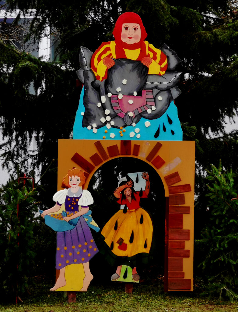 So beginnen die drei Märchen, deren Figuren vorm Biebertaler Rathaus neben der Pyramide aus Eibenstock stehen. Die Szenen auf Holz wurden vor einigen Jahren in der Biebertaler Seniorenwerkstatt geschaffen. Zwei dieser Märchen haben ihren Urspung in Hessen.