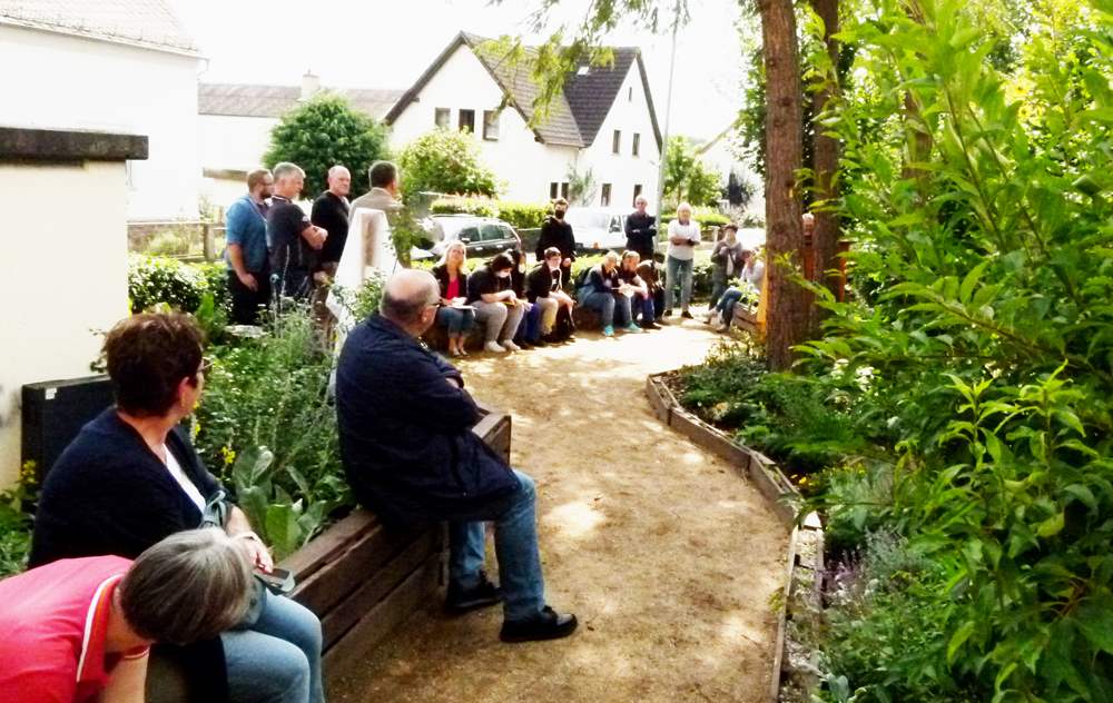 Das mit den Ideen galt auch besonders für die Jugendlichen, Leiter und Ausbilder/innen der Firma Evenius. Werkstattleiter Herr Kompe hob die Zusammenarbeit und Unterstützung durch das ganze Evenius-Team hervor, Herr Geller, Schreinermeister, musste Corona-bedingt eine Auszeit vom Betrieb nehmen, die er nicht ungenutzt verstreichen ließ. Er beschäftigte sich intensiv mit Wildbienen. Herausgekommen ist ein wunderbares Wildbienenhaus, das – obwohl erst seit Juni in Betrieb – ganz offensichtlich schon sehr gut genutzt wird. Das heißt, beim Wildbienenhaus wurde alles richtig gemacht. Wildbienen leben solitär, also einzeln. Niemand bewacht ihr Haus, wenn sie auf Nahrungssuche sind. Also müssen die Futterflanzen „um die Ecke“ wachsen. Deshalb wurde Frau Schwarzer von Engelhardt-Baumschulen dazu geholt. Die Jugendlichen – darunter etliche junge Frauen – von Evenius legten drei Beete mit höherem Rahmen an für niedrige, mittelhohe und hohe Stauden, und Frau Schwarzer suchte die passenden Pflanzen aus.