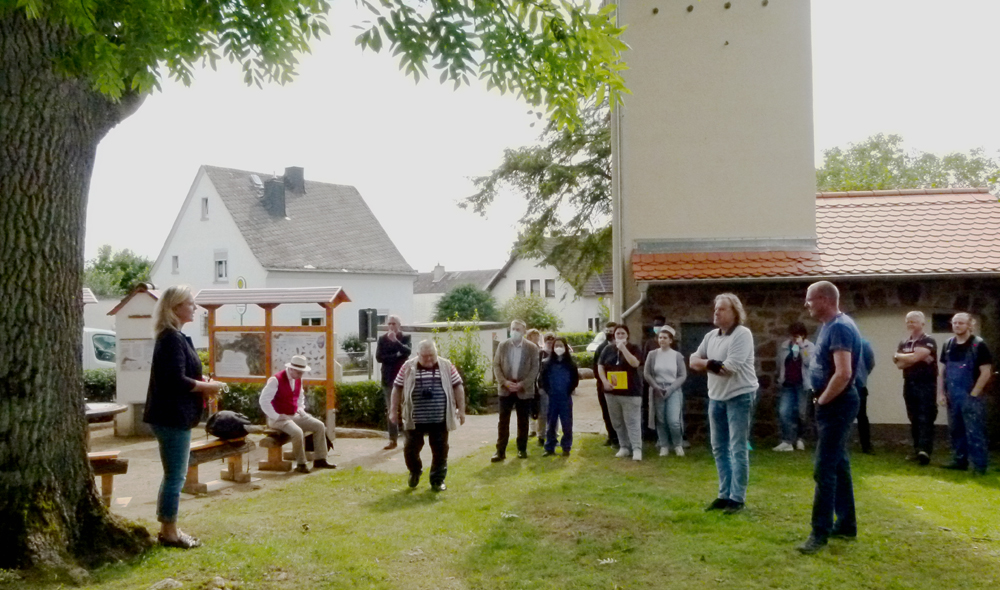 Der Nabu-Rodheim-Bieber hatte die Idee, den ungenutzten Trafo-Turm Fledermäusen zur Verfügung zu stellen. Der Nabu-Dachverband steuerte große Schaufafeln bei, oben am Turm wurden 7 unterschiedliche Fledermauskästen aufgehängt. Dann kam eines zum andern: Man könnte doch noch Bänke aufstellen, eine Sitzgruppe wäre schön, geeignet für Gruppen von Kitas und Grundschulen, aber natürlich für jeden, der neugierig auf unsere heimlichen, heimischen Mitlebewesen ist. Die Gemeinde, ihr Bauhof kamen mit ins Boot, „Woher bekommt man Geld?“ Da gab es was von der Umweltlotterie „Genau“, aber der Landkreis steuerte allein 80% der benötigten Gelder hinzu. Das Dach wurde von der Firma Ruppert gedeckt, die Fassade vom Malerbetrieb Gombert verschönert, Hecken von einzelnen Senioren beschnitten. Und wohl jeder, der schon eingebunden war, insbesondere aber Markus Schmidt vom Nabu Rodheim-Bieber, hatte mehr Ideen, „man könnte doch noch…“