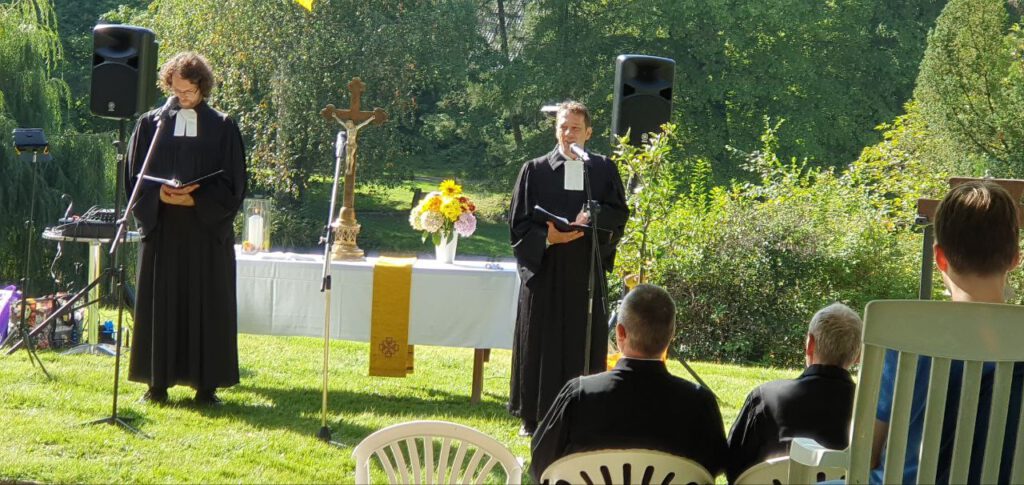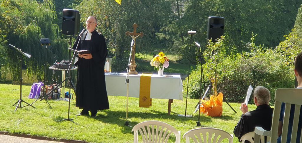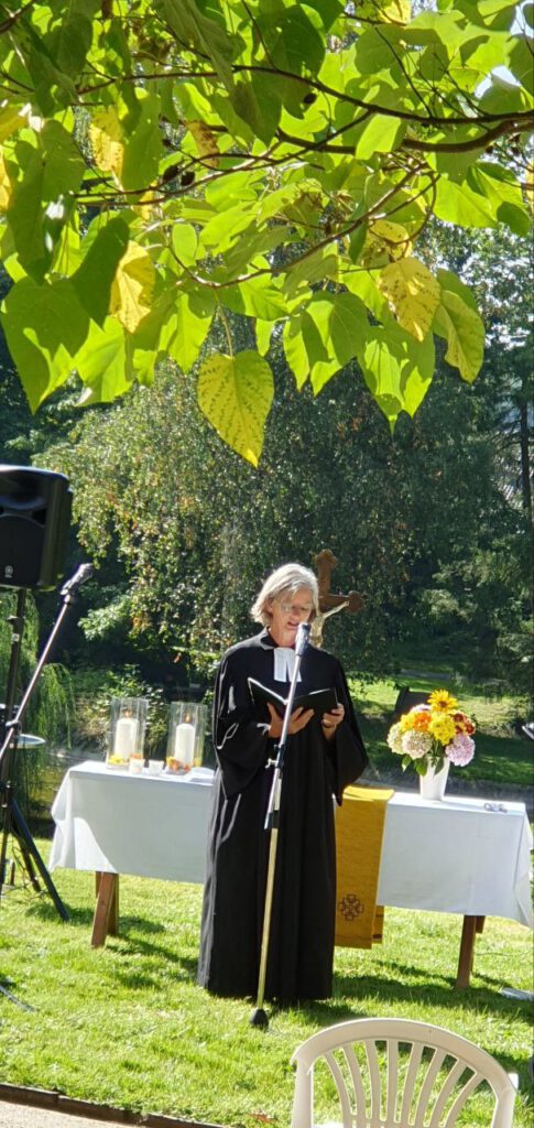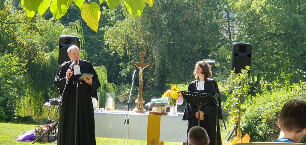 Geschätzte 400 – 450 Personen aus ganz Biebertal, aus allen Kirchengemeinden und politischen Gremien aller Ortsteile waren zur Einführung der neuen Pfarrerin Miriam Seidel und ihres Mannes Torsten Böhm in den Gailschen Park gekommen. Pfarrer Andreas Specht, stellvertretender Dekan des Dekanates Gießen, moderierte die Einführung, ebenso die Verabschiedung der Pfarrerin Imogen Kasemir-Arnold, (Gießen). aus Biebertal nahmen die Pfarrer Daniel Schweizer, Manuel Eibach, der Gemeindepädagoge Christian Kammler teil, außerdem der Vikar Christoph Schlosser aus Heuchelheim. Sie wollten sich außerdem von Pfarrerin Kasemir-Arnold verabschieden.