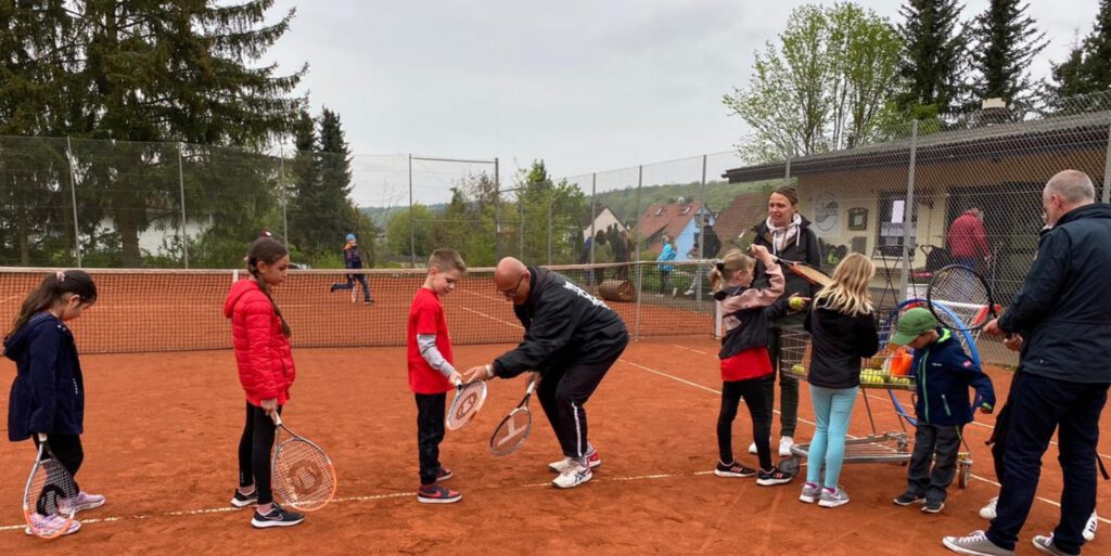 Des Weiteren nutzten einige Mitglieder des TV Bieber den Tag, um endlich mal wieder im Freien zu spielen. Interessierte Gäste probierten ihr Können mit dem Üben von Aufschlägen und an der Ballwand. Trainer Achim Schwemmer zeigte Ihnen dabei Grundlagen des Tennis und erklärte die Technik.
