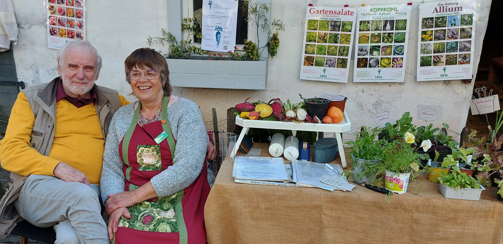 Foto oben von Valeria Best: Geburtsgskind Winfried mit Eveline am VEN-Stand; großes Foto (Ev. Renell) von links die Bete-Sorten Bulls Blood, Burpees Golden, Early Wonder, Geante Blanche und Jaune de Vauriac