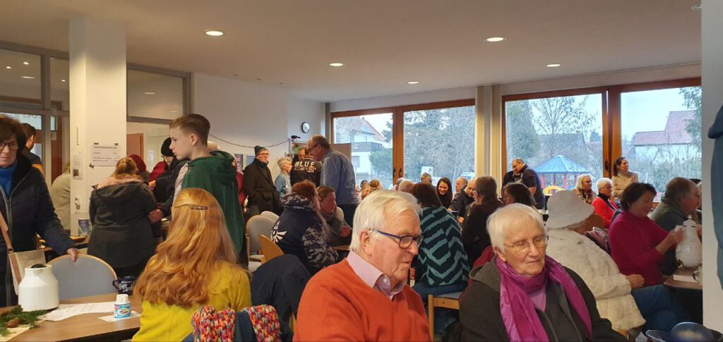 Neben diesen Programmpunkten war vor allem im Bürgerhaus eine bunte Palette an Weihnachtlichem zu finden: Der Heimatverein Rodheim-Bieber präsentierte den >Heimatkalender 2023<, der Freundeskreis Gail`scher Park das Buch >Der Traum vom Paradies – Der Gail´sche Park – Eine Geschichte von Tabak, Liebe und Gartenkunst< und vieles mehr vom Selbstgestrickten, Gebastelten, von Partnern aus Tansania, über Socken, Mützen, Glücksbienchen, Bienenwachs, Holz, Papier, Schmuck, Mira Diehl mit Sachen aus dem #3-Lädchen. Ebenfalls auf Rodheim bezogen war die kleine Broschüre, die Mechthild Koch anbot: Hildegard Lang: „Reise nach England“. Hildegard Lang wurde 1938 in Rodheim geboren und lebt seit 1958 in England. Die Broschüre sowie das 1. Buch „Biebertal“ stehen in der Bücherei Am Bornweg zur Ausleihe bereit.