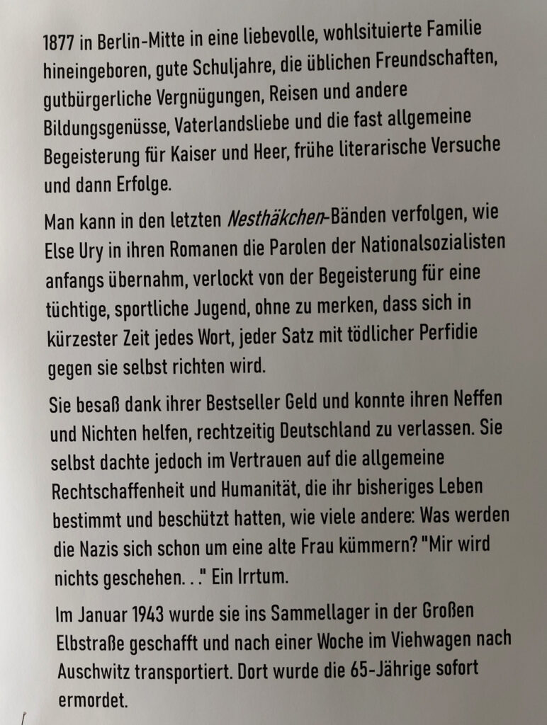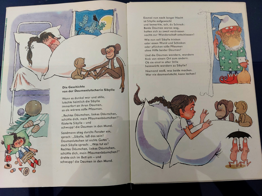 Die unterschiedlichsten Themen werden angesprochen in dieser Ausstellung, die Jutta Failing aus ihrer eigenen Kinderbuchsammlung zusammengestellt hat. Man könnte sie mit der ganzen Familie inklusive Urgroßmutter besuchen. Jede/r würde was aus dem eigenen Buchschatz finden. Ganz modern ist das Buch „Hanni hat Nikoläuse“ von 1921, über 100 Jahre älter dagegen die Buchreihe „Nesthäkchen“ (1913- 1925) von Else Ury. Kein Datum konnte ich finden bei der Geschichte von der am Daumen lutschenden Sybille. Der Struwwelpeter aus dem Jahre 1845 wurde in vielen Versionen nachgemacht. Immerhin werden hier die Daumen nicht abgeschnitten, sondern fliegen einfach davon. Dass dem Buch das Erscheinungsjahr fehlt, ist eher normal gewesen, nicht nur bei Kinderbüchern.