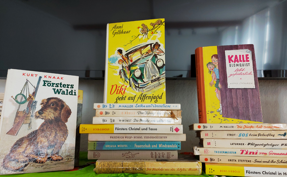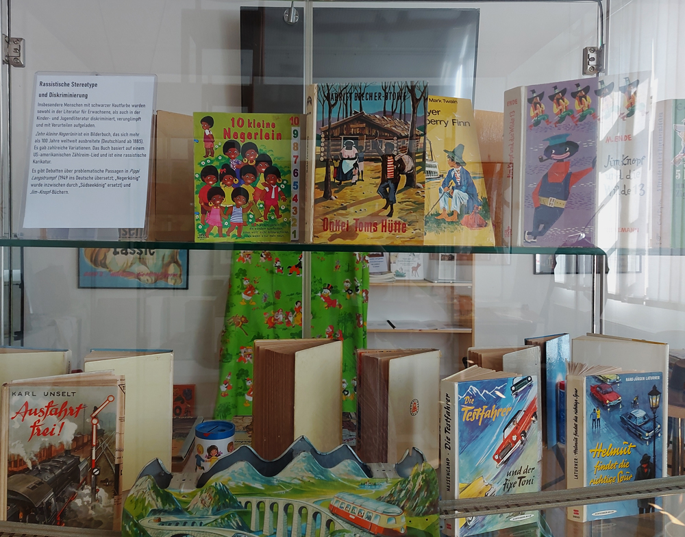 Failing zeigt die Unterteilung in Mädchen- und Jungenbücher, stellt aber auch solche aus, die heute so nicht mehr geschrieben würden, weil sie eindeutig rassistisch sind. Dazu gehören viele Abenteuerbücher, die teilweise in den ehemaligen deutschen Kolonien spielen, aber auch welche über Albert Schweitzer. Selbst Astrid Lindgrens „Negerkönig“ wird inzwischen bei Neuauflagen von Pippi Langstrumpf-Büchern als Südseekönig bezeichnet. Das Lied „10 kleine Negerlein“ haben wir noch in der Schule gelernt, ohne zu wissen, dass es ein Schwarze verunglimpfender Text aus den amerikanischen Südstaaten ist. Auch Kinderbücher verkörpern Zeitgeschichte und Politik.